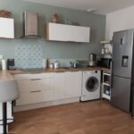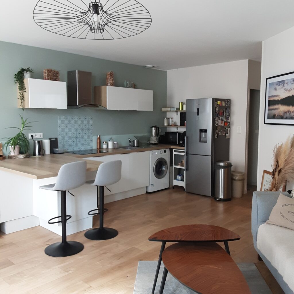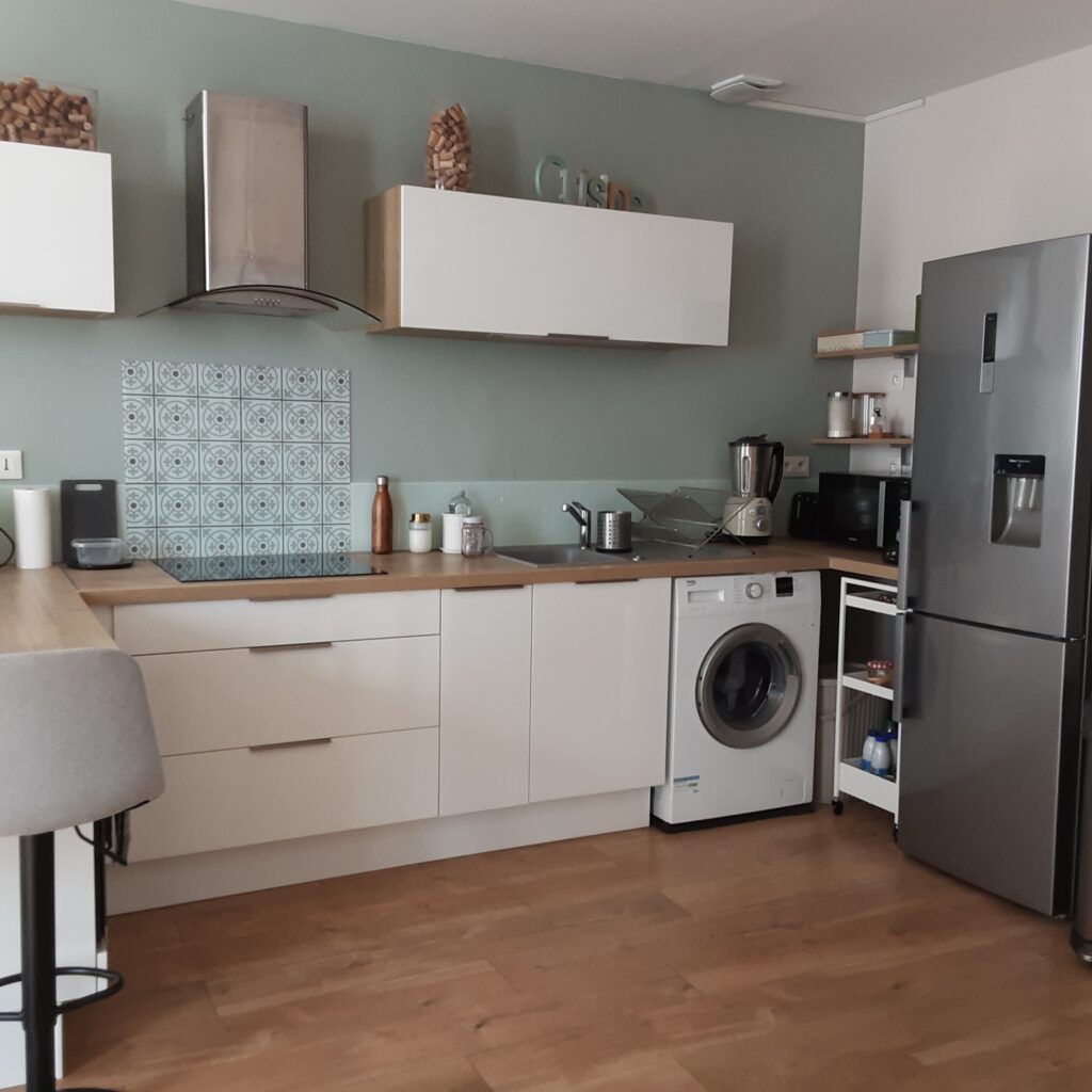 Une pièce principale séjour cuisine de 29.43 m². La cuisine est entièrement équipée et aménagée de four, plaques, four micro onde, frigo et machine à laver