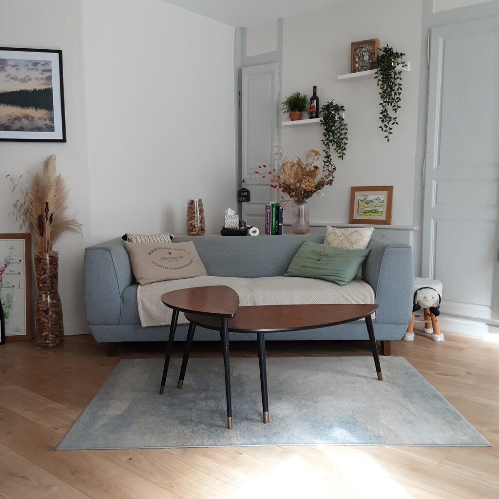 Le séjour est meublé d’un canapé et de tables basses