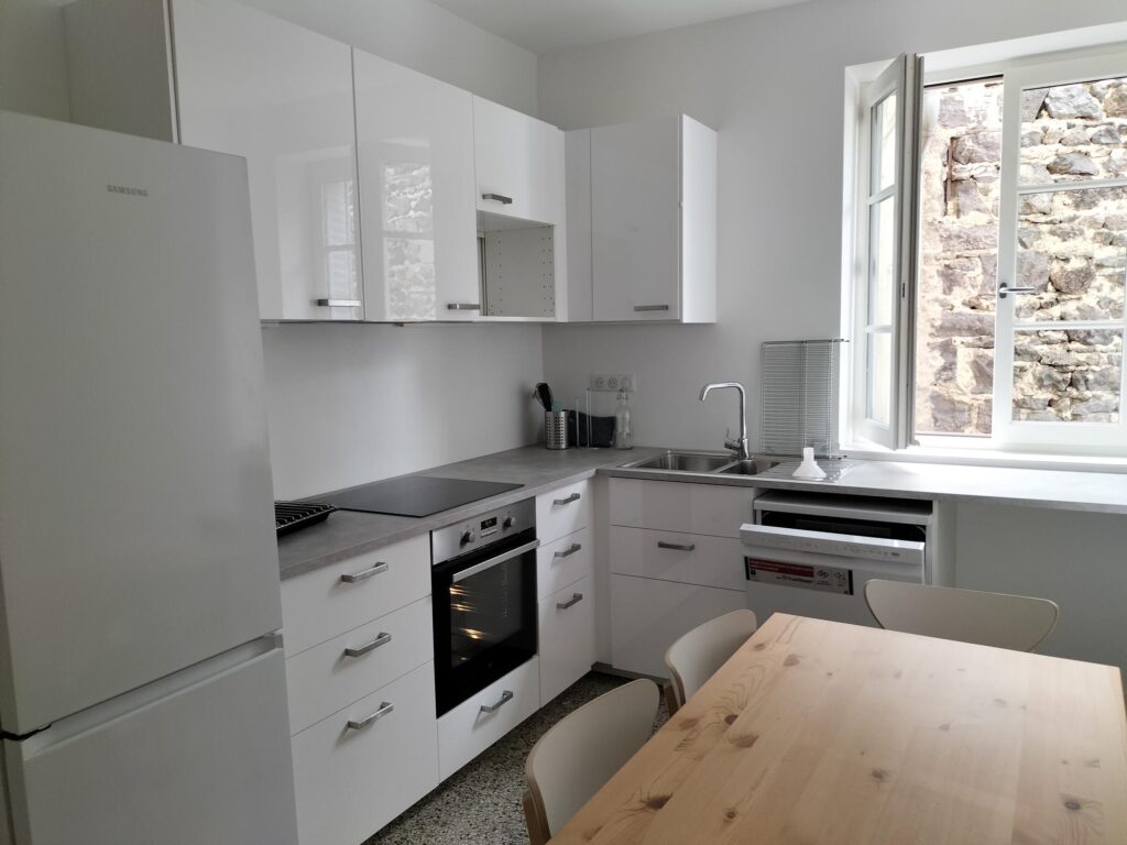 Un séjour ouvert sur la cuisine intégralement équipée et aménagée de four, plaque, hotte, machine à laver, lave vaisselle