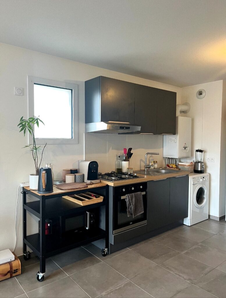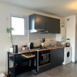 Une pièce principale ouverte sur une cuisine aménagée et équipée de four, plaque et hotte,